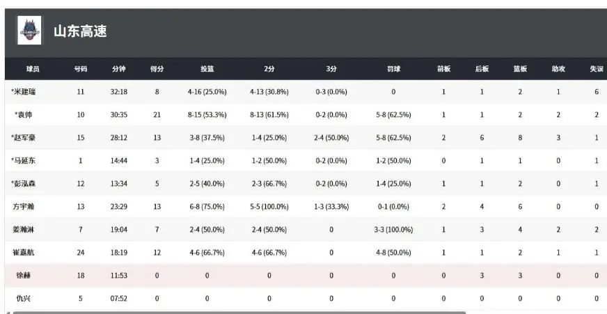 山东队此役4人得分上双,赵军豪13分,崔嘉航12分,袁帅21分。相比其他球员方宇瀚引人关注,此役也展示了奇兵的角色。方宇瀚出战23分29秒,贡献13分6篮板,其中二分球5中5,命中率百分百,三分球3中1,罚球1中0。