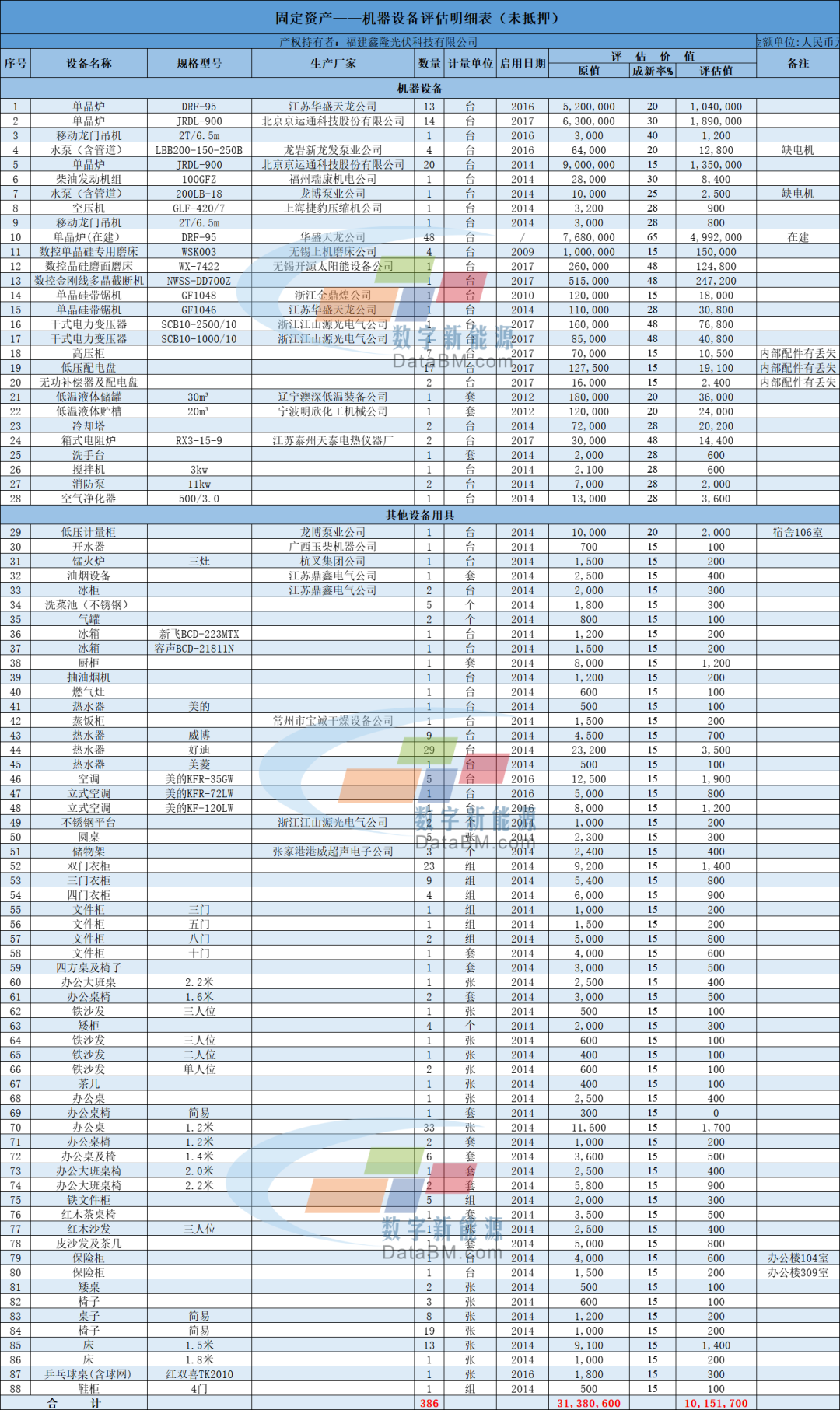 公告显示,本次拍卖起拍价约659.26万元,加价幅度3.2万元,保证金66万元。拍卖标的物为福建鑫隆光伏科技有限公司名下的111项机器设备,其中包含23项已抵押机器设备和88项未抵押机器设备(明细详见文末表格)。