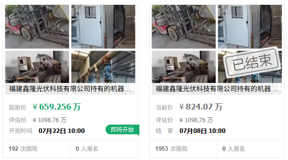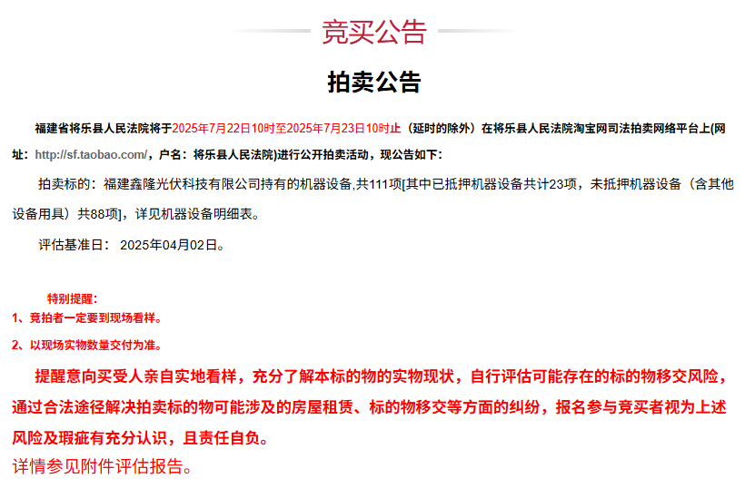 数字新能源DataBM.com从某司法拍卖平台获悉,福建省将乐县人民法院将于2025年7月22日10时至2025年7月23日10时止,在福建省将乐县人民法院淘宝网司法拍卖网络平台上进行公开拍卖活动,对福建鑫隆光伏科技有限公司名下的111项硅棒、硅片生产设备进行拍卖。